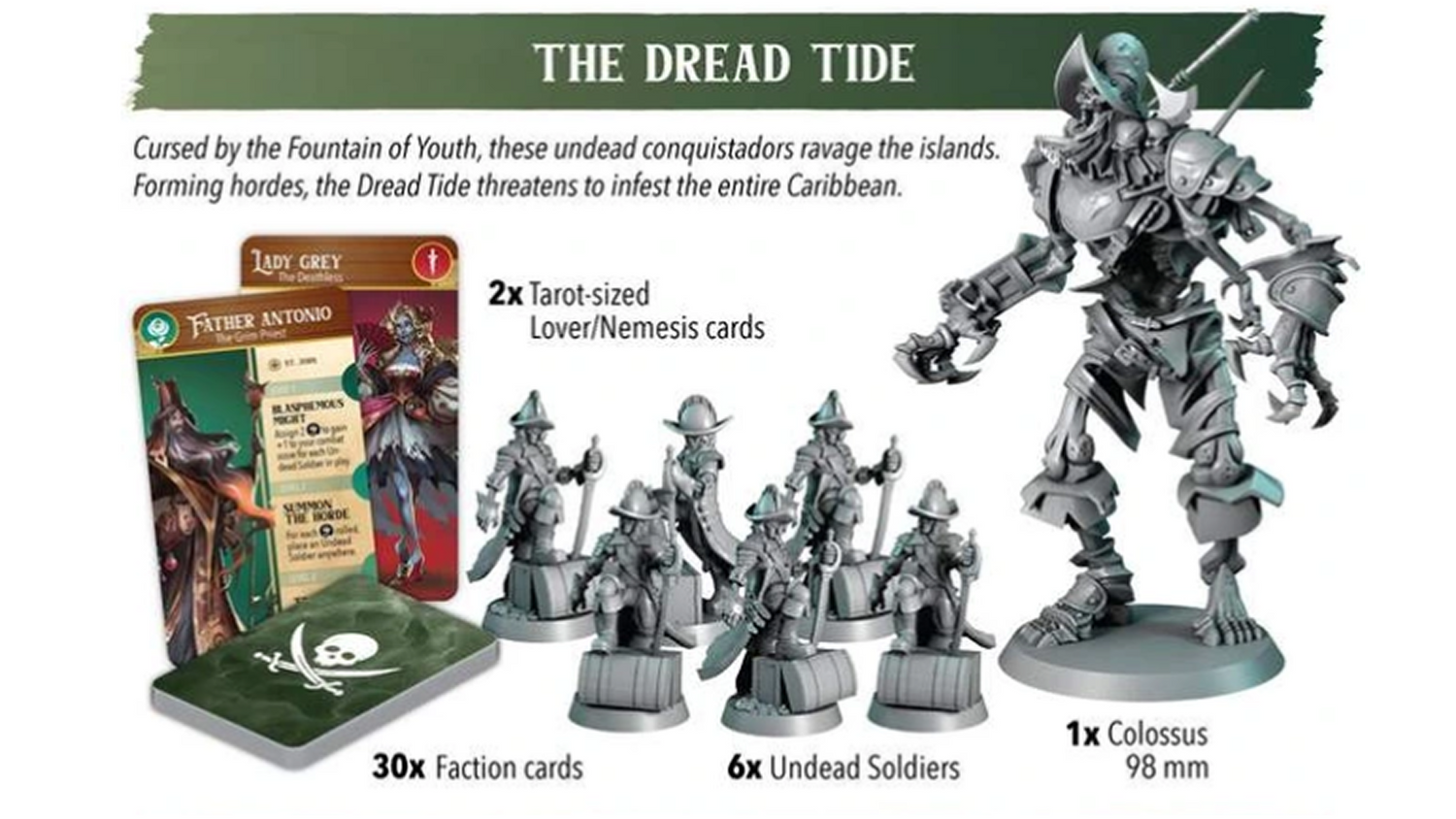 Cursed by the Fountain of Youth, these undead conquistadors ravage the islands. Forming hordes, the Dread Tide threatens to invest the entire Caribbean.